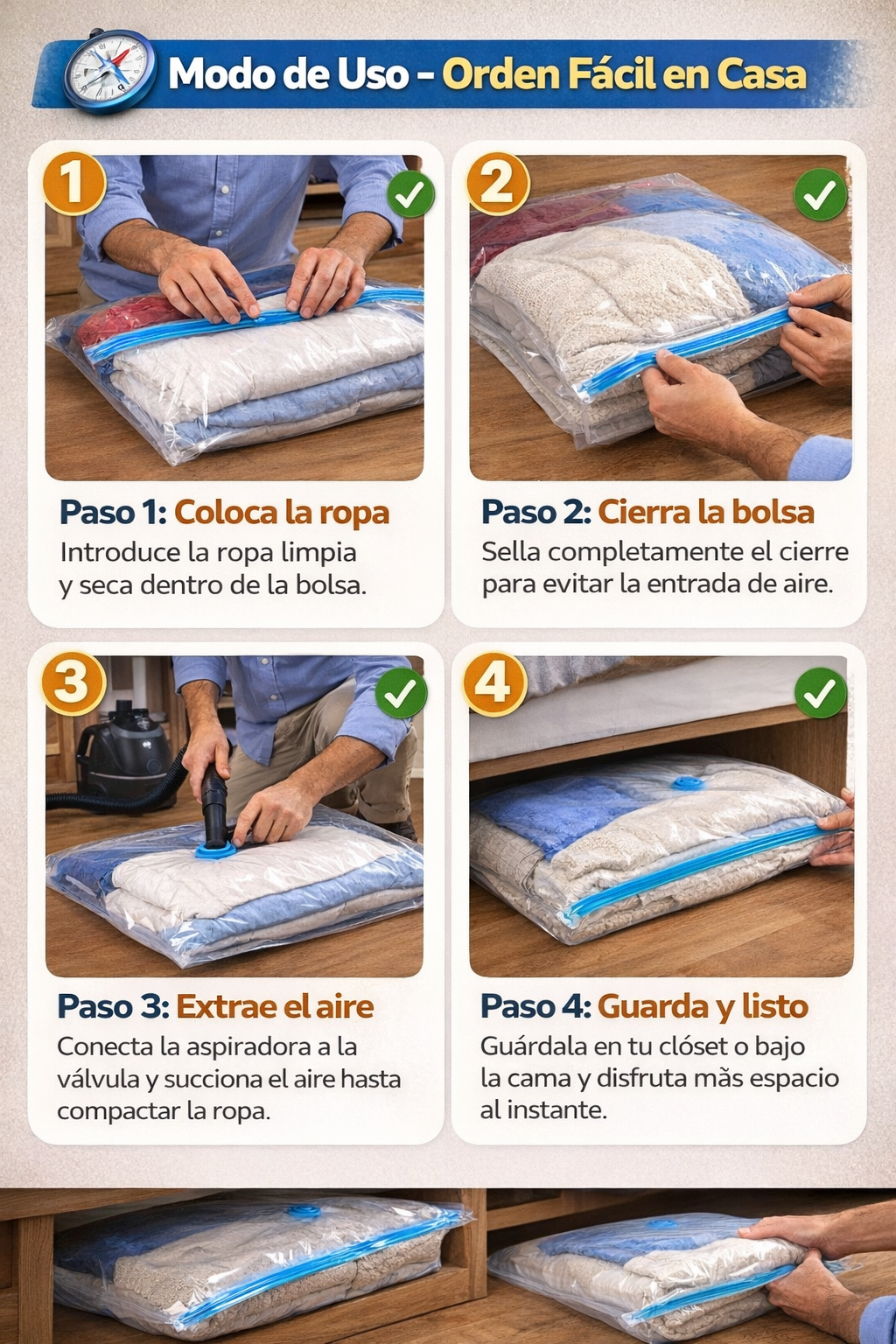 ✨ Con la Bolsa Compresora de Ropa al Vacío – Optimiza Espacio – Ropa Ordenada y Protegida al Guardar, puedes reducir hasta un 80% el volumen de tu ropa y recuperar espacio real en tu clóset o bodega 🧺🏠