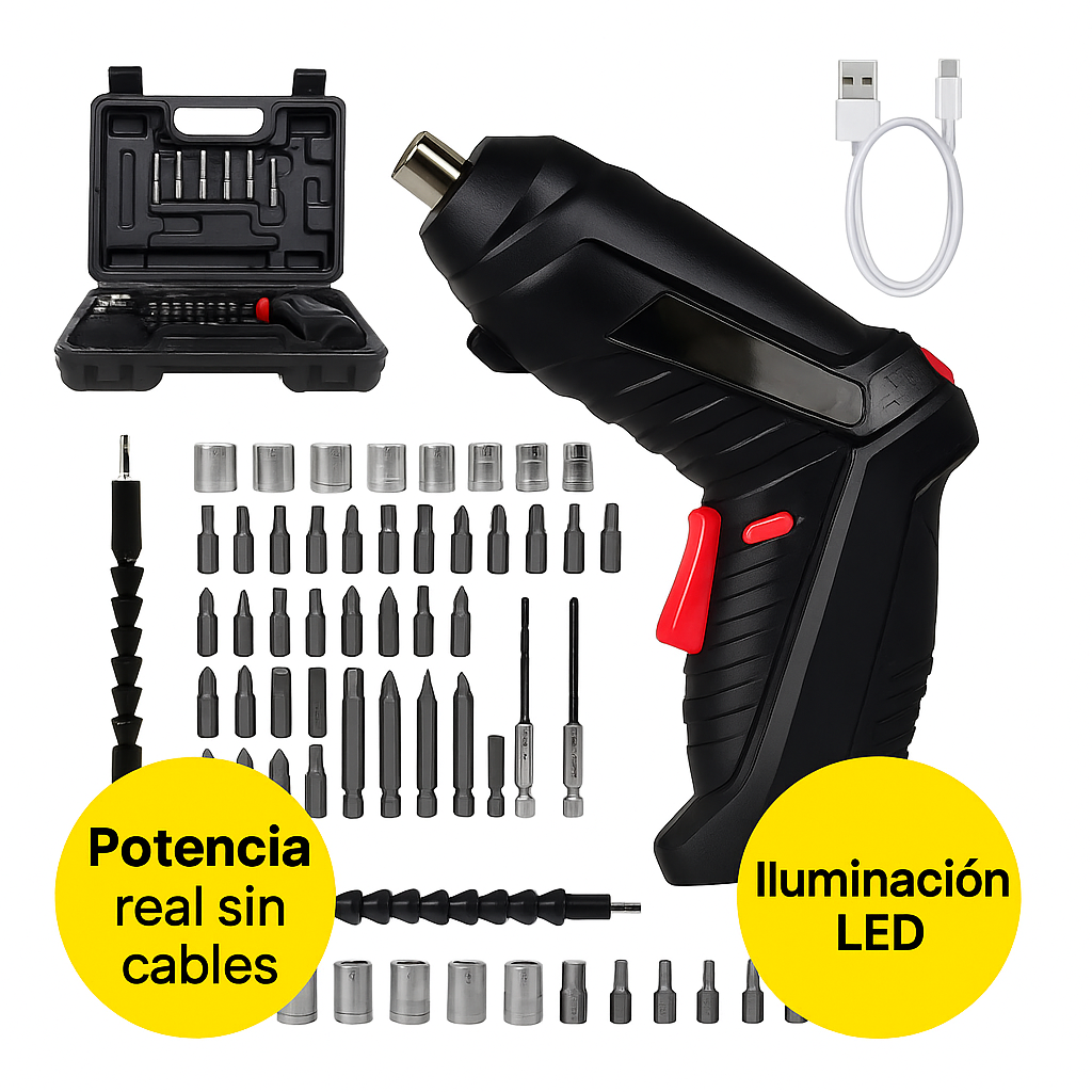 Olvídate de perder horas armando muebles. Con el Destornillador Eléctrico Inalámbrico tendrás tus proyectos listos en minutos: portátil, recargable por USB y con luz LED para que nada te detenga. ¡Hazlo fácil y rápido!