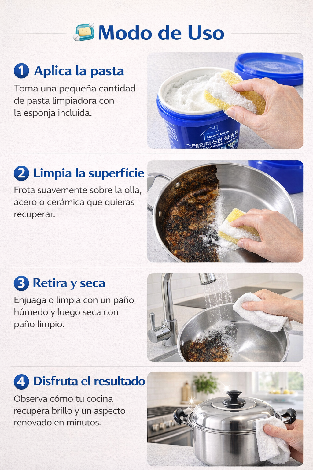 ¿Pensabas que esas ollas ya no tenían arreglo? 🍳😩 Con esta pasta de limpieza multifuncional puedes devolverle el brillo a ollas, acero y cerámicas en minutos ✨🧽 Sin botar nada, sin gastar de más y sin usar mil productos distintos. Un solo paso, un solo producto y una cocina que vuelve a verse limpia de verdad 🏡💚