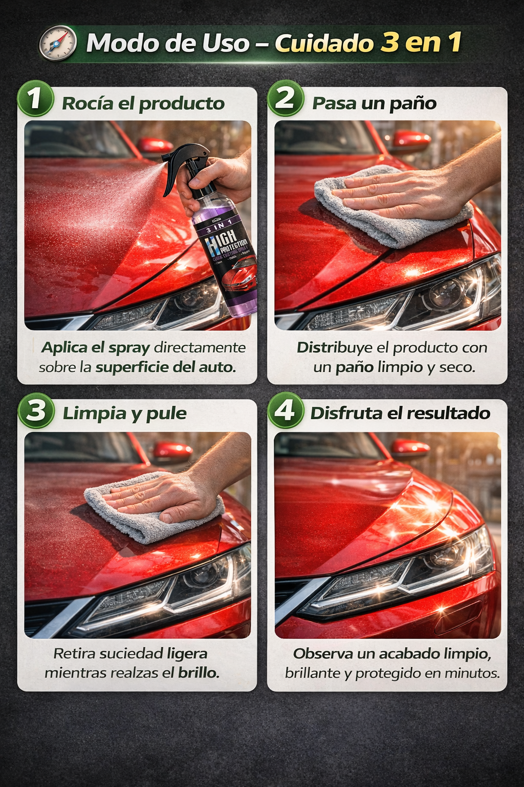 Con nuestro Spray Cerámico 3 en 1, cuidar tu auto es rápido, fácil y efectivo 👌